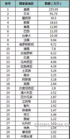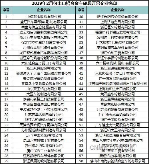 2019年2月,中國(guó)鋁合金車(chē)輪共計(jì)出口110個(gè)國(guó)家和地區(qū),數(shù)量≥1萬(wàn)只的有30個(gè)具體數(shù)據(jù)見(jiàn)下表: